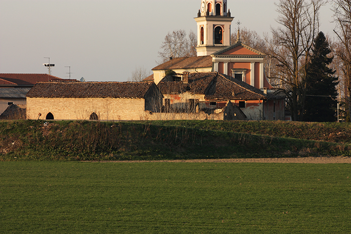 Fra i due si crea una sorta di via interna, stretta fra i due blocchi ma comunque proporzionata. Elemento di rottura rispetto a tale conformazione è il fienile, o almeno ciò che ne resta. Volume pilastrato, a pianta libera, con la sola eccezione della parete cieca verso l’argine. Il complesso è circondato da un ampio spazio verde su tre lati, questo lo valorizza rispetto ai fabbricati adiacenti. Interessante e di valore è inoltre il rapporto di complementarietà che si crea con la facciata della chiesa parrocchiale.